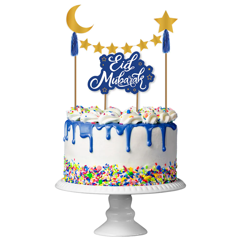 - Taartdecoratie Set Eid Mubarak- Bestaande uit: 2 cocktailprikkers met mini vlaggenlijn en 2 cocktailprikkers met Eid Mubarak print- Materiaal: 98% paper, 2% hout