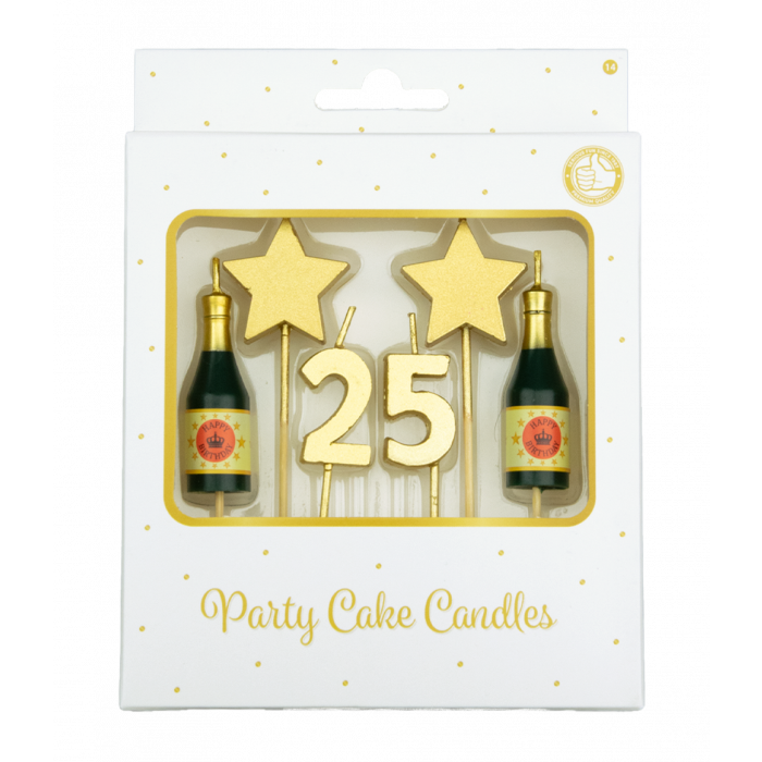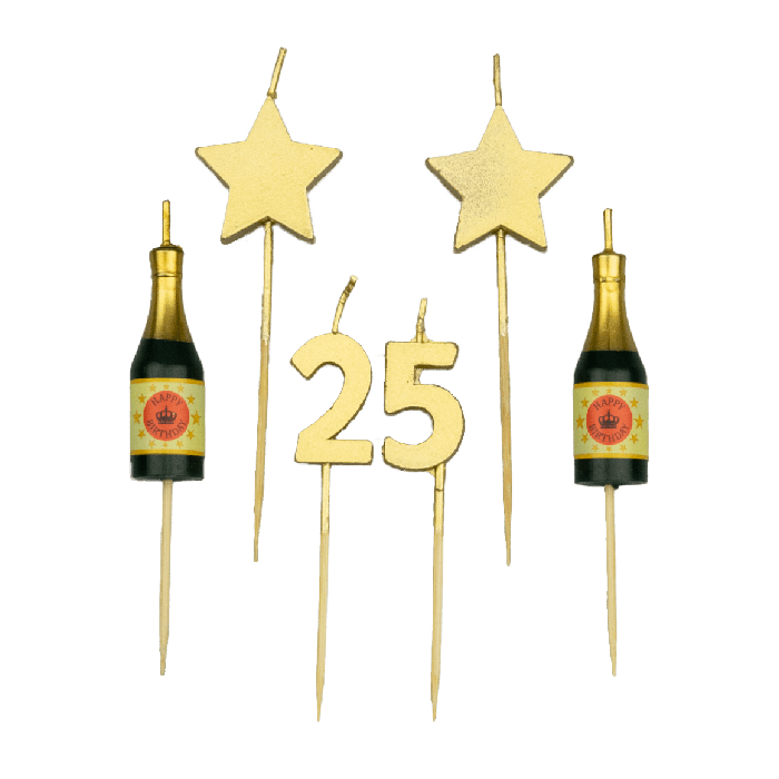- Taartkaarsjes Set 25 Jaar- Inhoud: 6 kaarsjes- Afmeting: Lengte 17,5cm en hoogte: 2,5cm