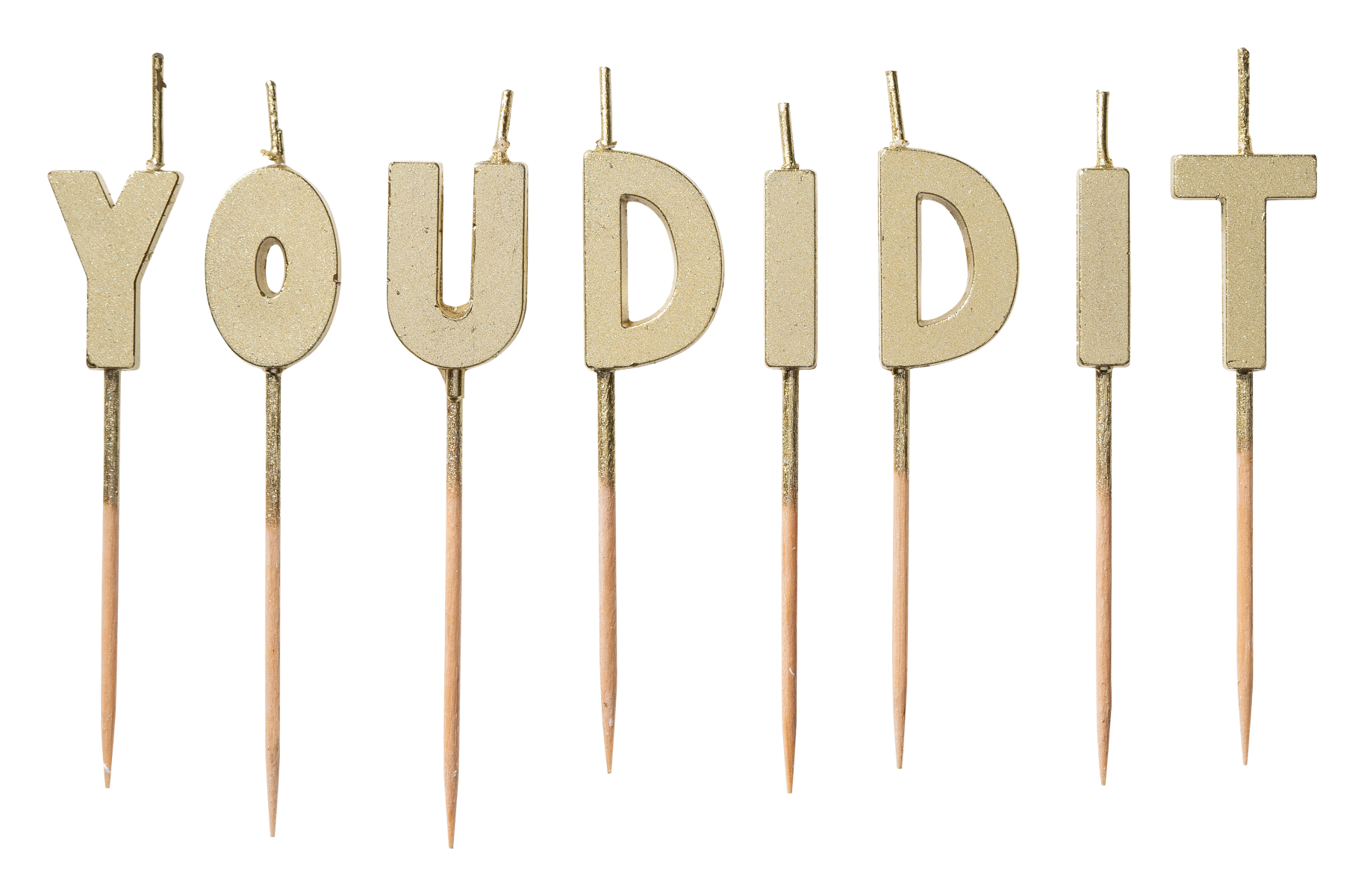 - Taartkaarsjes 'You Did It'- Bestaande uit: 8 gouden letters- Afmetingen: ± 7,5cm (L)- Materiaal: Wax