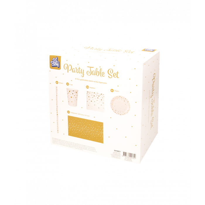 - Tafelgerei Decoratie Set Goud/WitSet bestaat uit: 8 x bekers16 x servetten 8 x bordjes 8 x rietjes1 x tafelkleed (274 x 137cm)