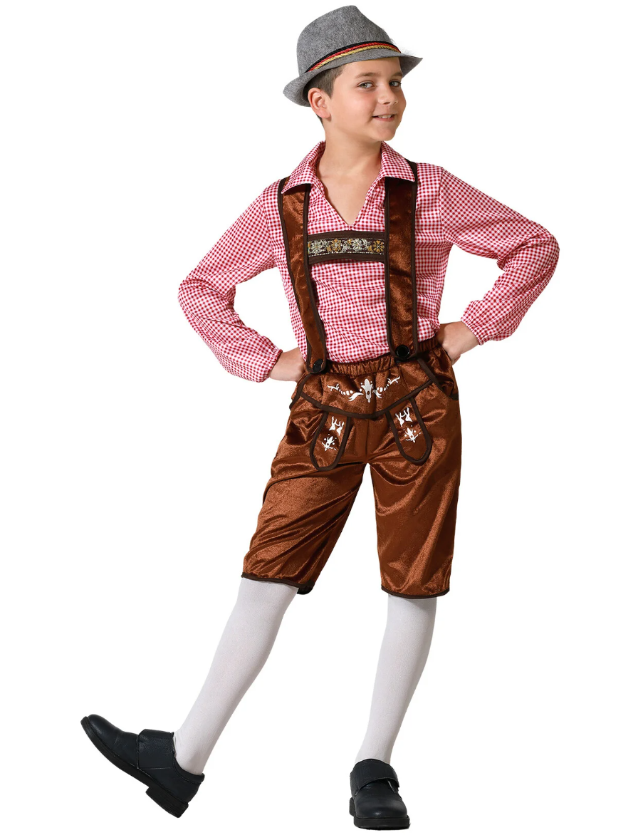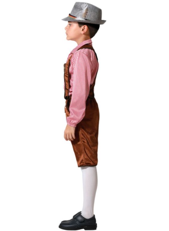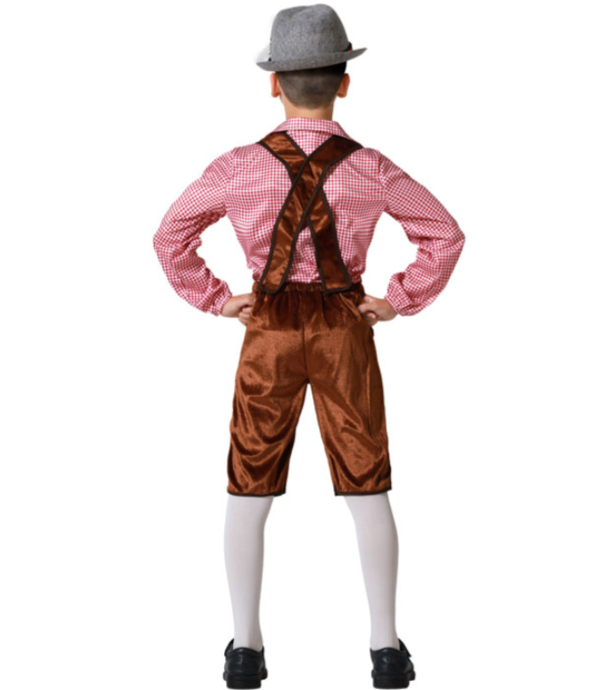 - Tiroler Kostuum Kind Bruin/Rood- Bestaande uit: Lederhose en Blouse- Materiaal: 100% polyester- Beschikbare maten: 3-4, 5-6, 7-9 en 10-12 jaar Exclusief accessoires!
