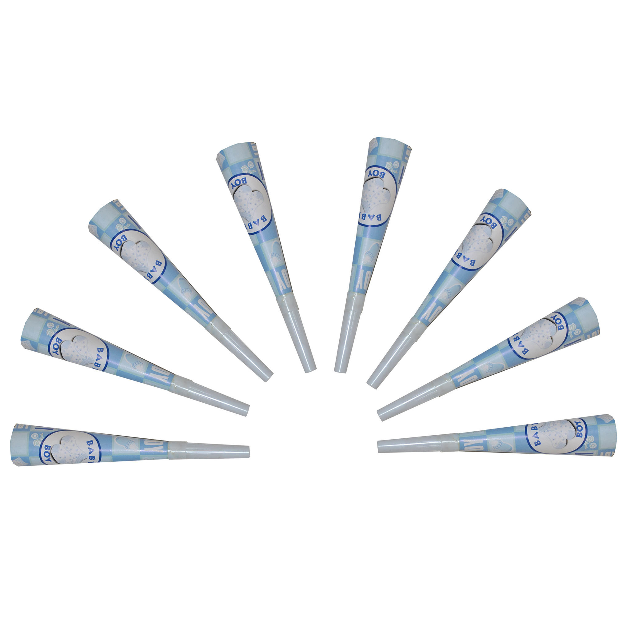 - Toeters Baby Boy- Hoeveelheid: 8 toeters- Materiaal: karton en plastic