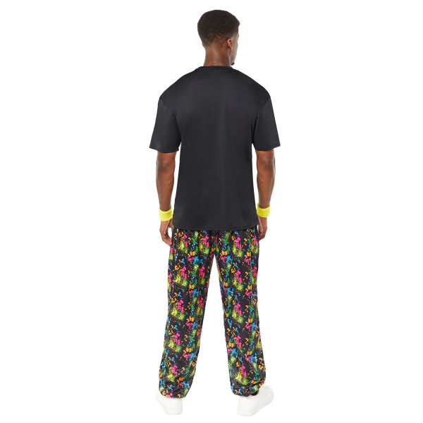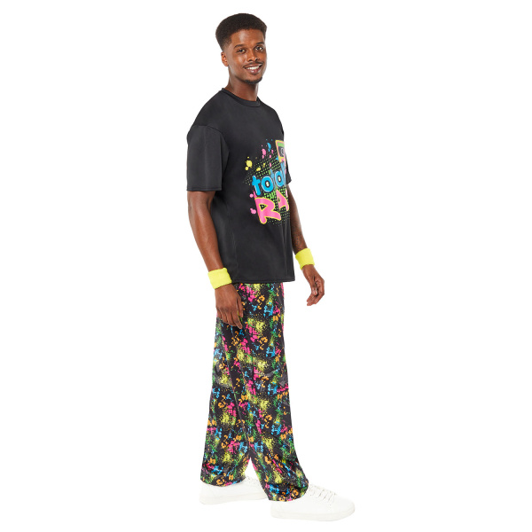 Ga terug in de tijd met dit Totally Rad 80s Retro Kostuum van Feestbazaar! Perfect voor themafeesten, carnaval, of elke gelegenheid waarbij je de iconische jaren '80-stijl wilt omarmen. Dit kostuum bestaat uit een zwart T-shirt met een kleurrijke "Totally Rad!" print en een retro boombox afbeelding, gecombineerd met opvallende, kleurrijke broek met een abstracte neonprint die typisch is voor de mode van de jaren '80. Compleet met gele polsbanden voor die authentieke fitness look.
