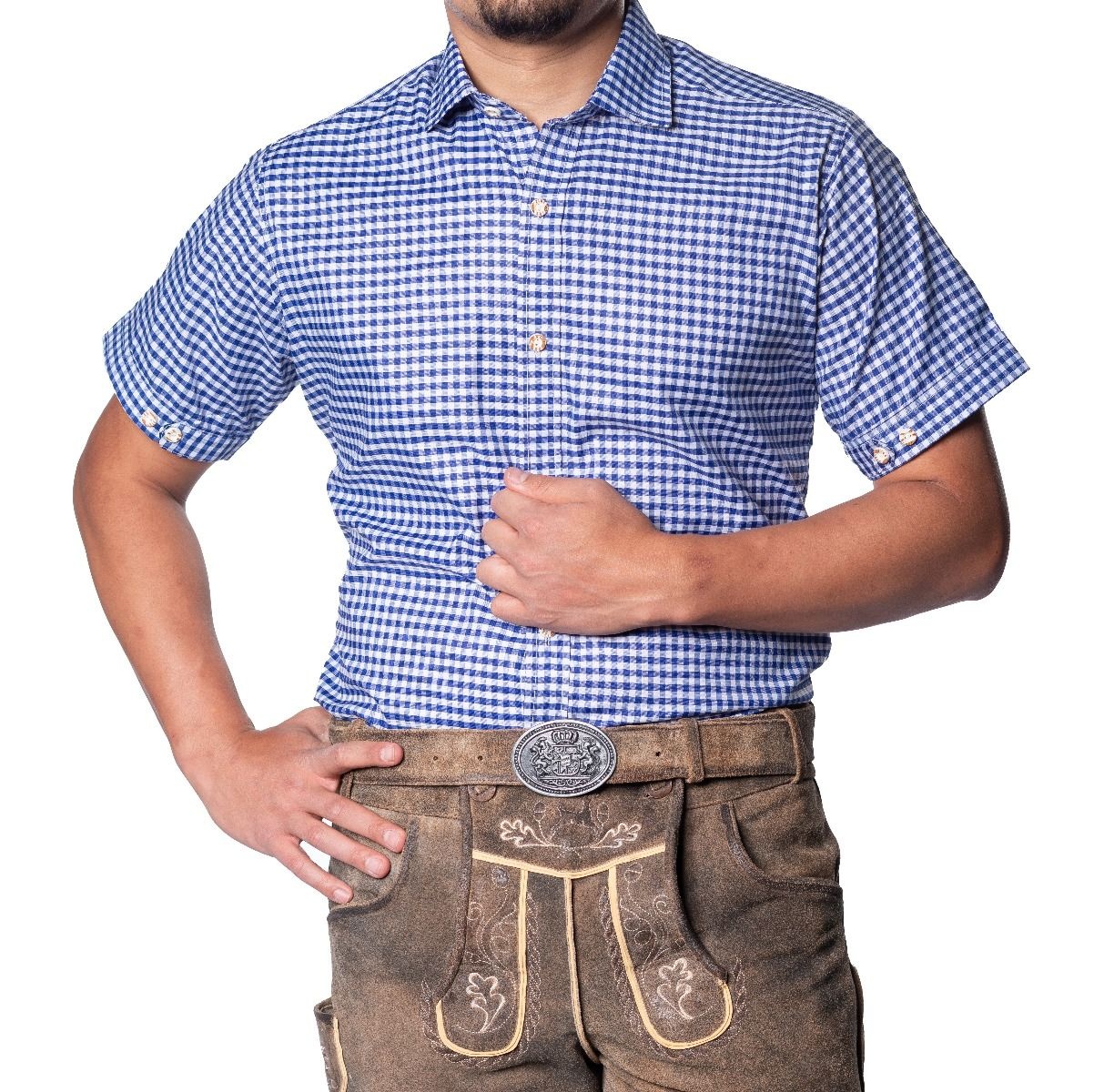 - Trachtenhemd Korte Mouw Leopold Blauw Geblokt