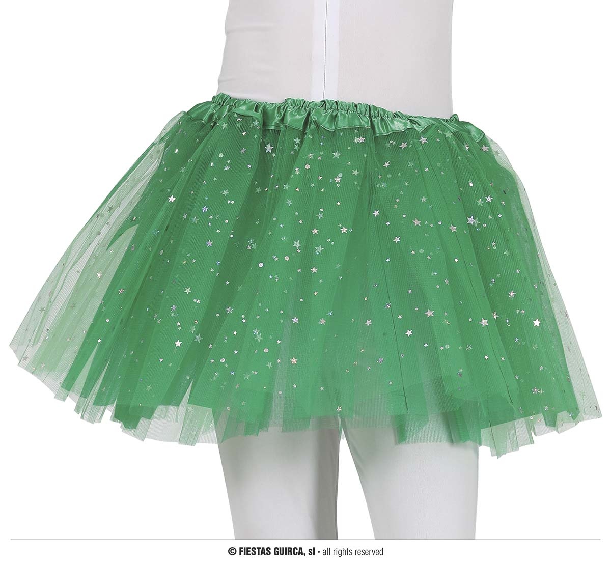 - Tutu Groen Met Zilveren Sterren Kind- Maat: One-size (elastiek in middel), lengte 30 cm- Materiaal: Polyester