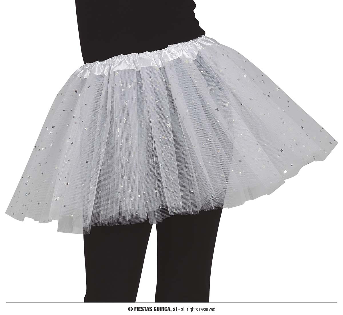 - Tutu Wit Sterren Kind- Maat: One-size (elastiek in middel), lengte 30 cm- Materiaal: Polyester