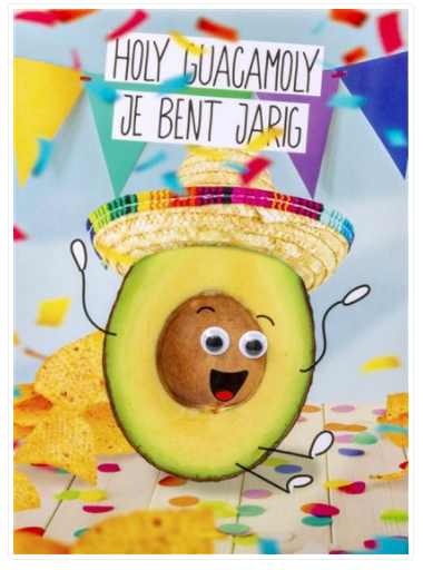 - Verjaardagskaart 'Holy Guacamoly Je Bent Jarig'- Afmetingen: 17 x 15cm- Materiaal: Karton- Inclusief Envelop (oranje)- De ogen van de kaart zijn er opgeplakt- Kaart kan opengeklapt worden om er een boodschap in te schrijven.