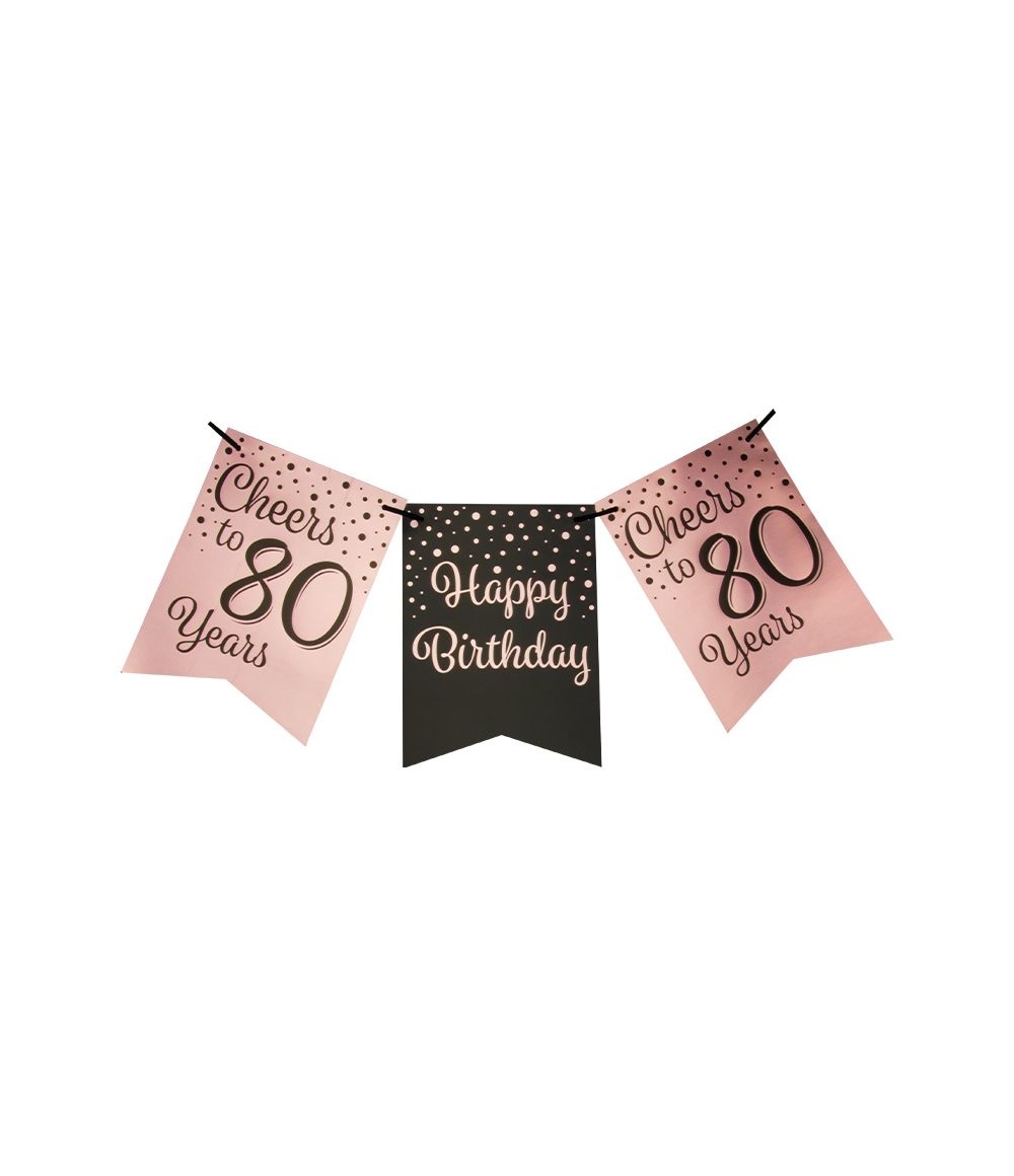 - Verjaardagsslinger Vaandel 80 Jaar Roze/Zwart- Lengte Slinger: 6m (10 vaandels aan 1 lijn)- Afmeting slinger: 20 x 14.5cm- Dubbelzijdig Gedrukt- Materiaal: Karton