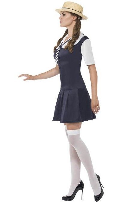 Dit leuke kostuum bestaat uit een marine gekleurde jurk met aangehechte gegolfde rok, een mini stropdas en bijpassende strohoed.