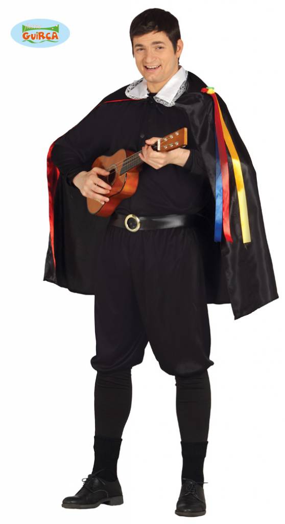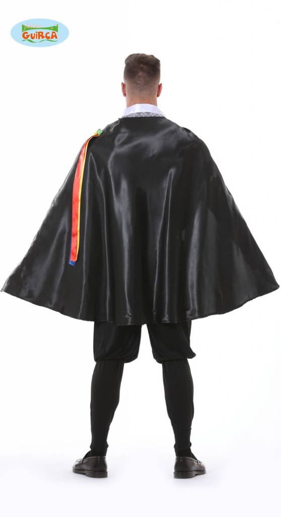- Verkleedkostuum troubadour man- Bestaande uit: Blouse, cape, driekwart broek en riem- Blouse is voorzien van klittenband en witte kraag. Cape en riem zitten er los bij. De driekwart broek is voorzien van elastiek- Maat One size (t/m ± L)