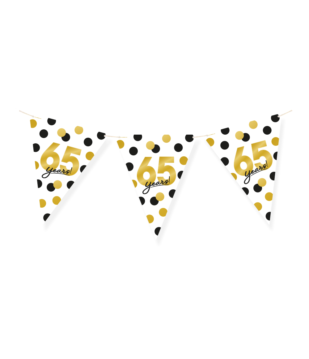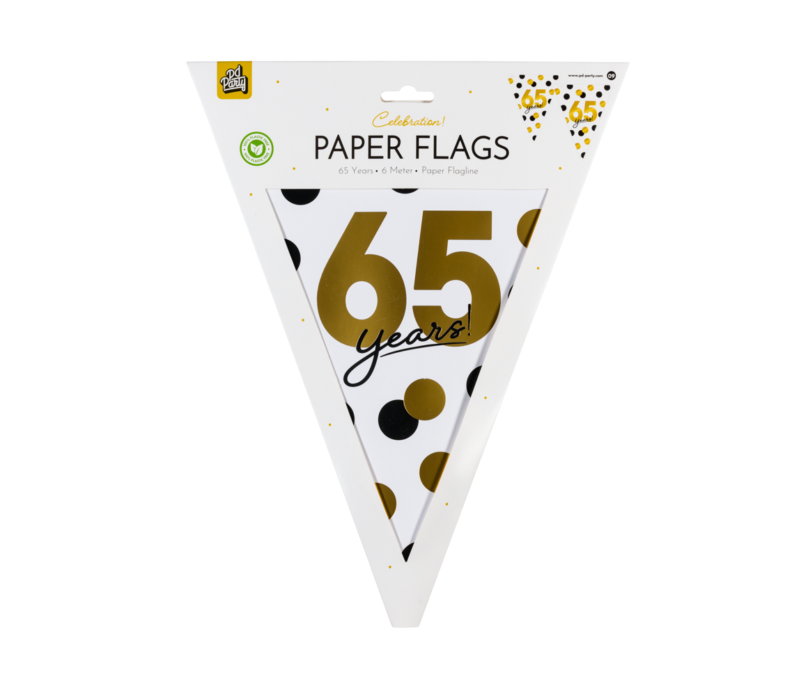 - Vlaggenlijn Celebration 65 Jaar Wit/Goud/Zwart - Afmetingen: 6 meter - Materiaal: Papier