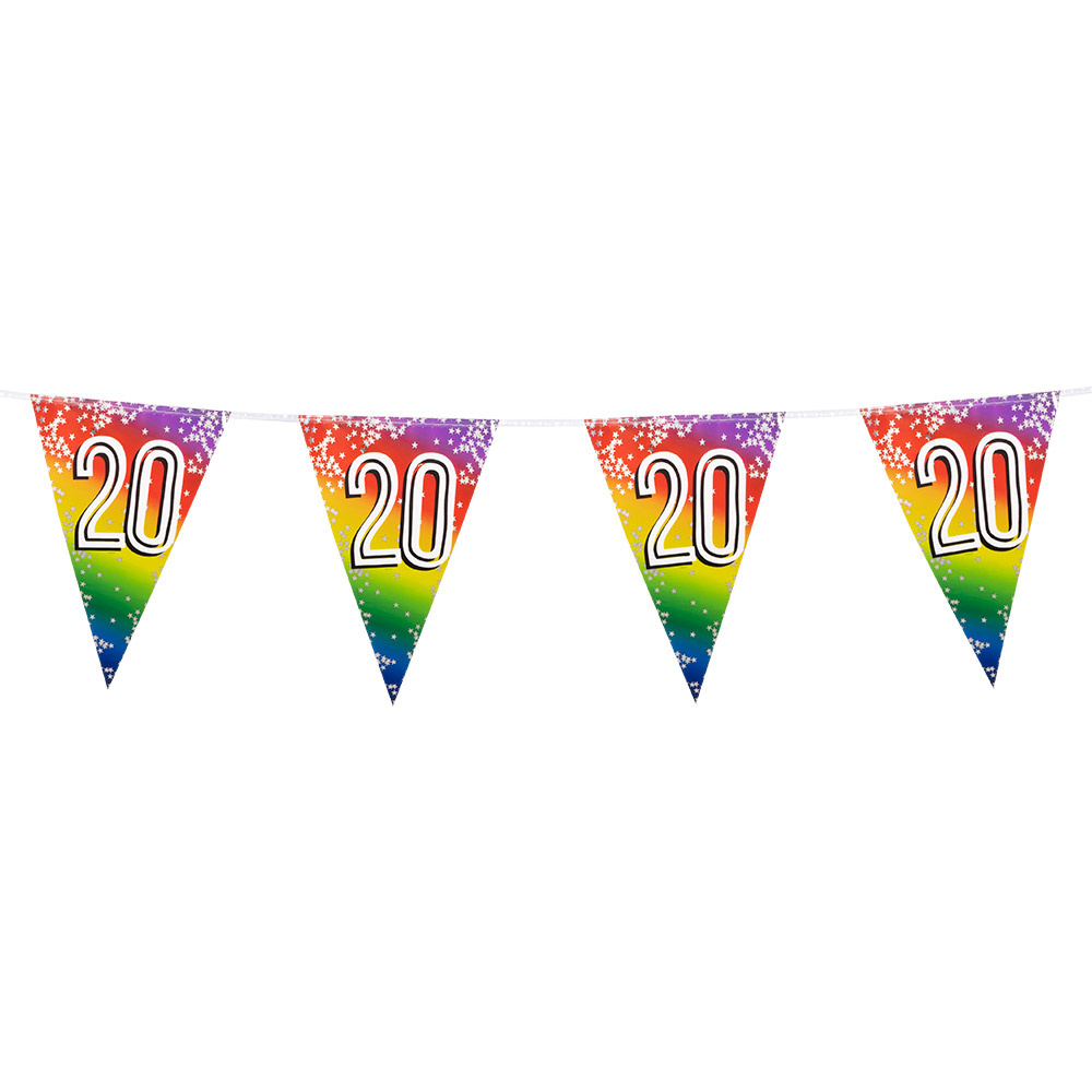 - Vlaggenlijn Cijfer 20 Regenboog Met Sterren- Lengte: 6 meter (15 vlaggen)- Afmeting vlaggetje: 30 cm x 20 cm - Enkelzijdig bedrukt, achterzijde is zilverkleurig- Materiaal: PVC