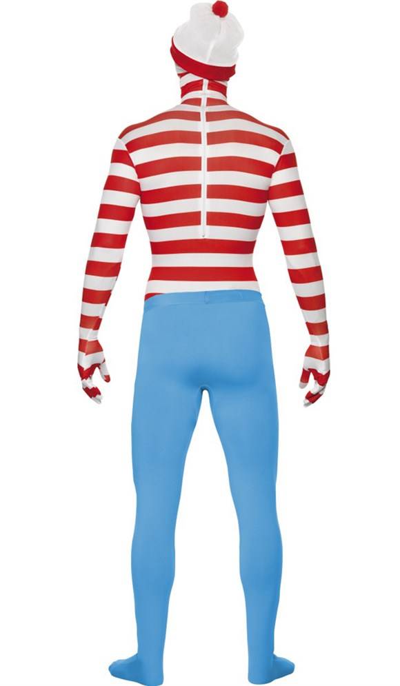 -Where's Wally second skin kostuum met zakje, verborgen gulp, opening onder masker, de muts en de bril.