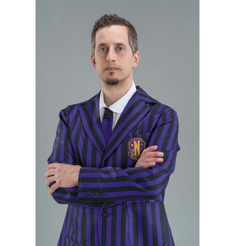 - Wednesday © School Uniform Heren Zwart/Violet- Bestaande uit: Jas, slabbetje/kraag met das, Broek- Maten S t/m L