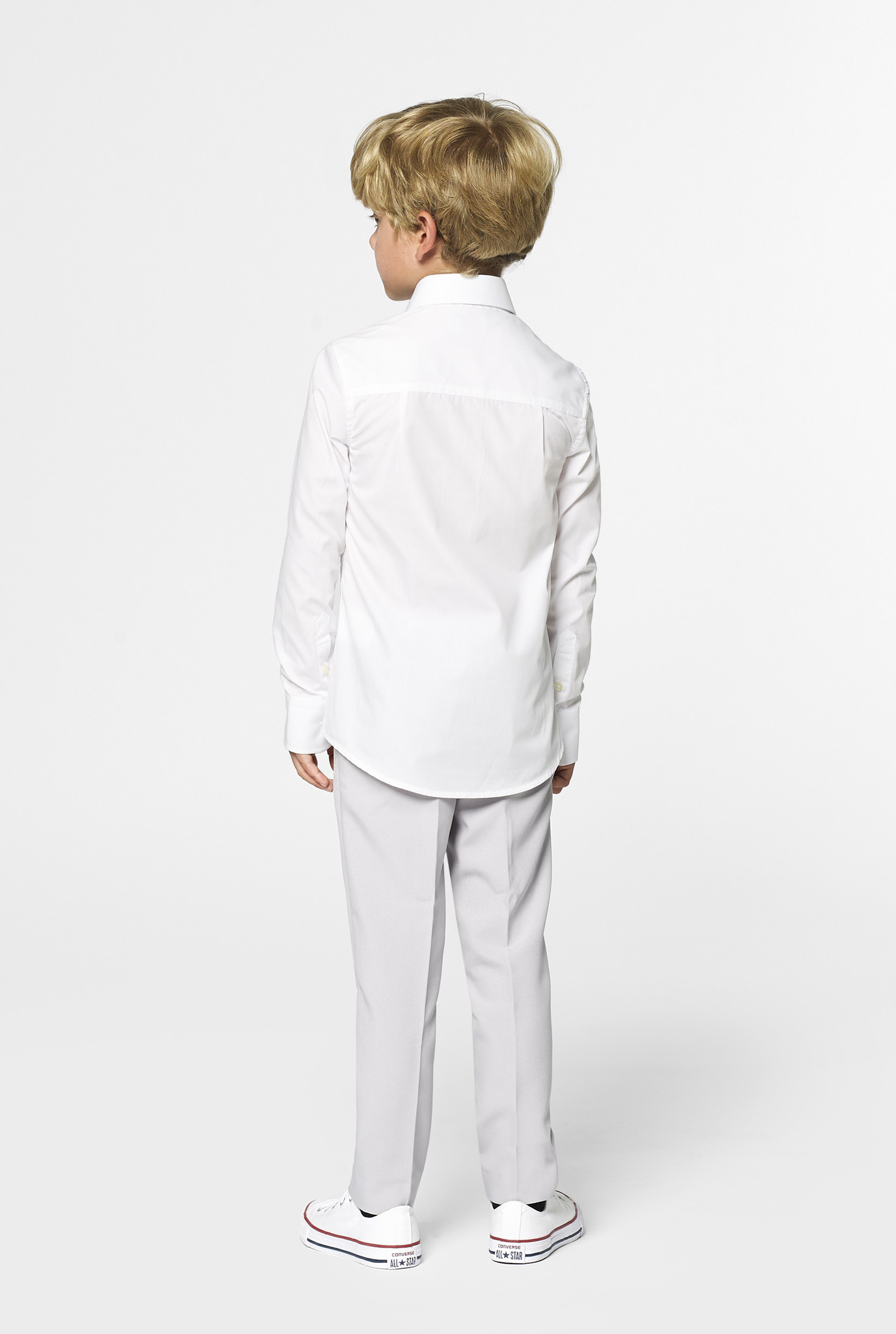 Op zoek naar een overhemd om de outfit van je kleine grote man compleet te maken? Dit witte jongens overhemd maakt elke look charmant en chic. Het is het ideale kledingstuk om met allerlei pakken te dragen, van uitgesproken tot basic varianten. Verder is het jongens overhemd lang genoeg om in de broek te stoppen – en daarin te blijven, zelfs als hij erin gaat spelen – want het is speciaal ontworpen om met een pak te dragen.