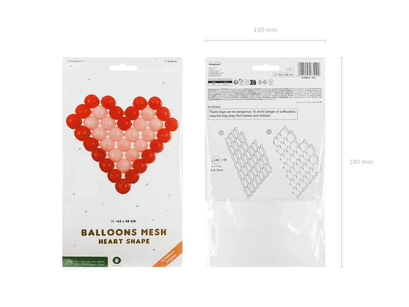 - Witte Hartvormig Ballon Frame- Afmetingen: 63x58cmHartvormig ballonnet van transparant plastic. De gevulde vorm is ca. 63 x 58 cm. Het net biedt plaats aan 38 ballonnen met een aanbevolen diameter van 8-10 cm.