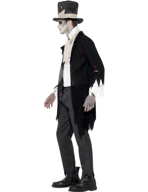 -Zombie Bruidegom kostuum bestaande uit: Jas met Vest, Sjaal, Broek, Hoge Hoed