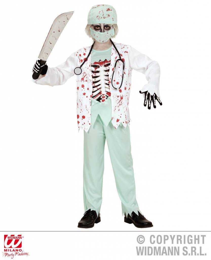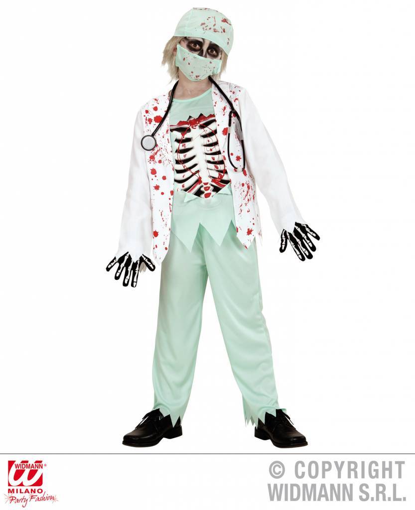 -Zombie dokter pakje kind-Bestaande uit± Bebloede jas met shirt, broek, muts, gezichtsmasker, stethoscoop -Maten 128, 140, 158